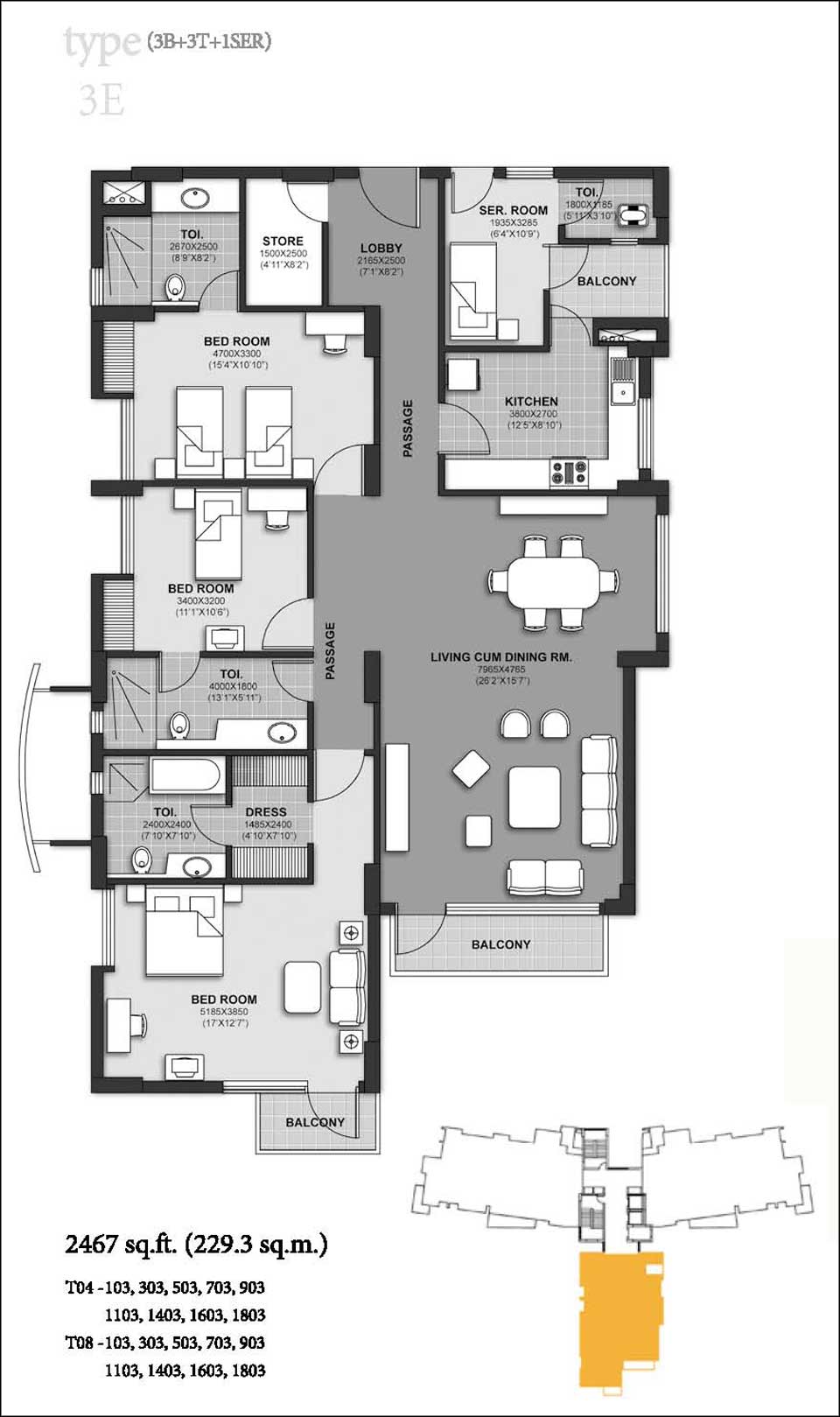 Floor Plan Type 3E (3B with 3Tand 1SER) (2467 sq